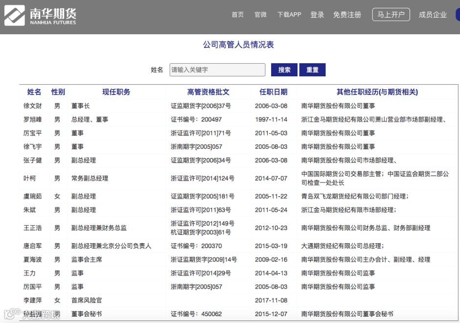过硬管理团队是南华期货稳步发展的重要基础。国内一线期货公司大多经历过换帅,而南华期货的管理团队则相当稳固,这点在行业内尤为可贵。南华期货法定代表人为罗旭峰,罗旭峰同时也是公司董事兼总经理,徐文财担任公司董事长。