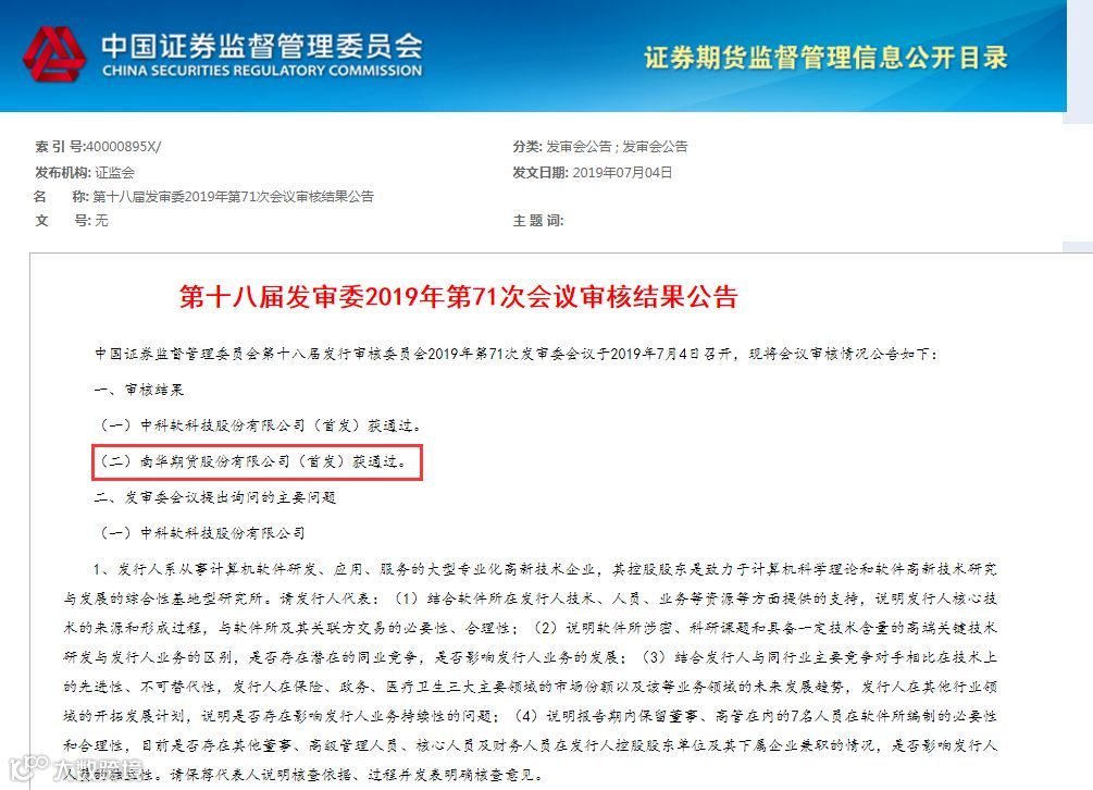 7月4日晚,中国证监会发布《第十八届发审委2019年第71次会议审核结果公告》,宣告南华期货首发获得通过。
