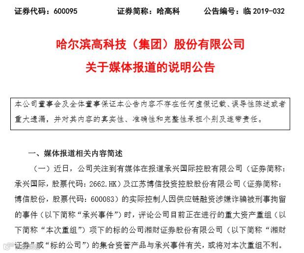 7月12日晚间,哈高科公告称,公司关注到近日有媒体在报道承兴国际控股及博信股份的实际控制人因供应链融资涉嫌诈骗被刑事拘留的事件时,评论公司目前正在进行的重大资产重组项下的标的公司湘财证券的集合资管产品与承兴事件有关,或将对本次重组不利。