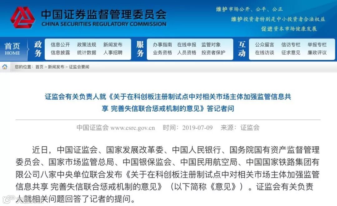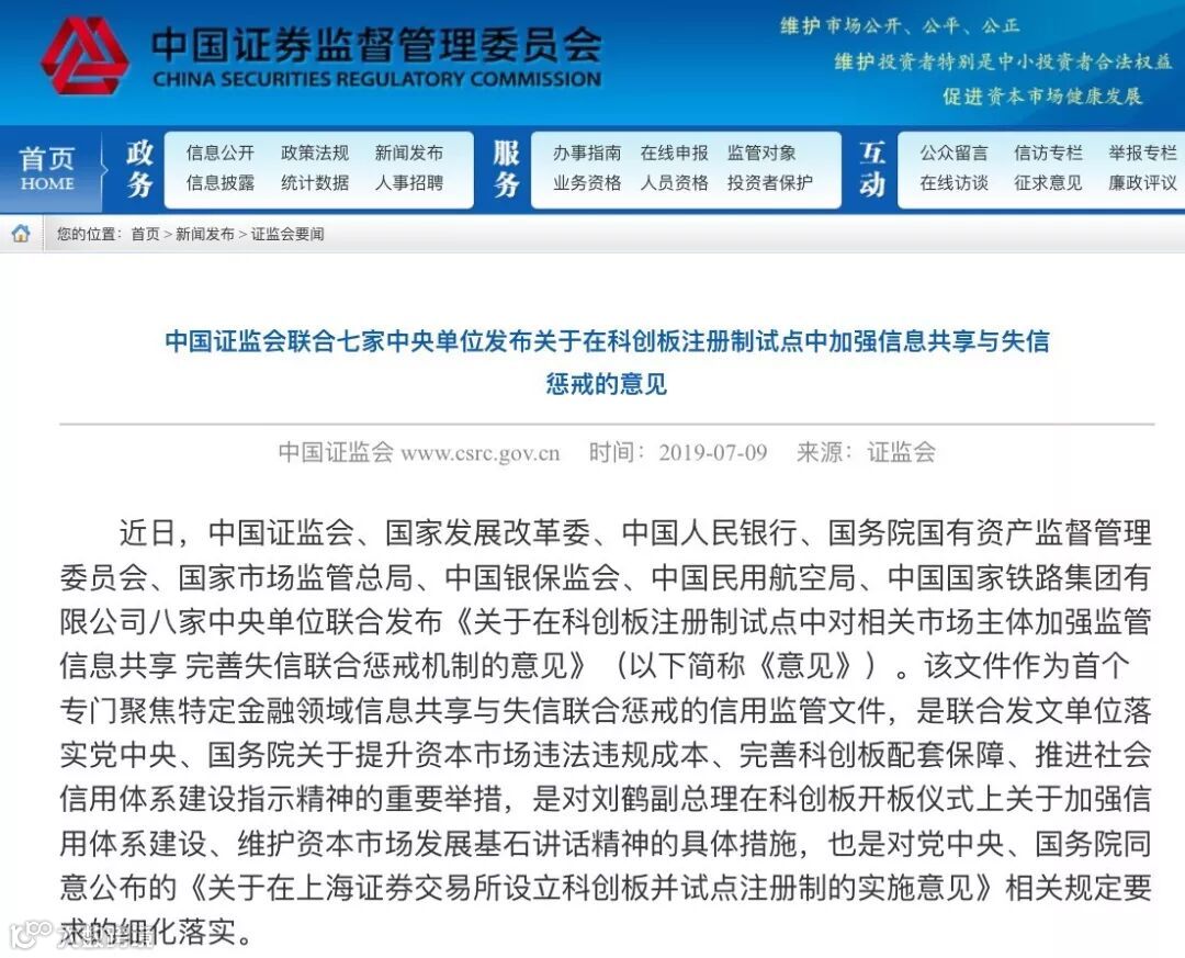 7月9日,证监会官网上披露《关于在科创板注册制试点中对相关市场主体加强监管信息共享 完善失信联合惩戒机制的意见》(简称《意见》),该意见由证监会、发改委、央行、国资委、国家市场监管总局、银保监会、民用航空局、国家铁路集团等八部委联合发布。