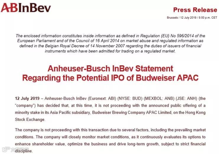7月13日,全球最大啤酒公司百威英博发表声明表示,已决定,此时,不再推进其旗下子公司百威亚太在中国香港的IPO计划。
