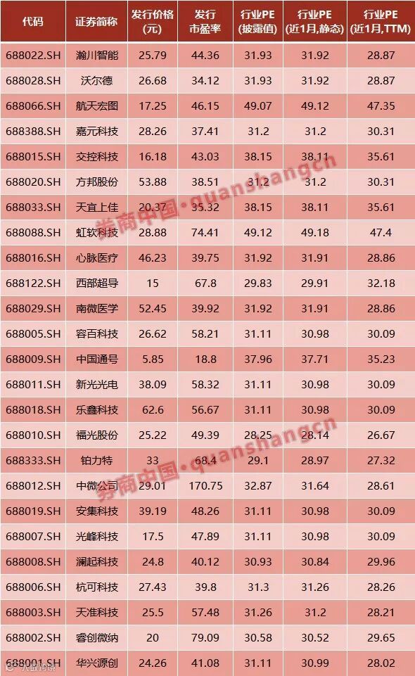 按照平均值计算,25家科创企业平均发行市盈率约在53倍(算数平均),剔除最高/最低值后平均约为50倍。无论是对标行业平均PE33倍的水平还是此前新股发行23倍的“红线”,科创板企业的市盈率水平都高出了。