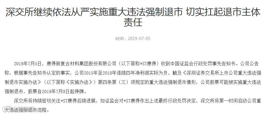 深交所5日晚间表示,深交所将持续密切关注康得新后续进展,如证监会对康得新作出上述最终行政处罚决定,深交所将第一时间启动公司重大违法强制退市流程。