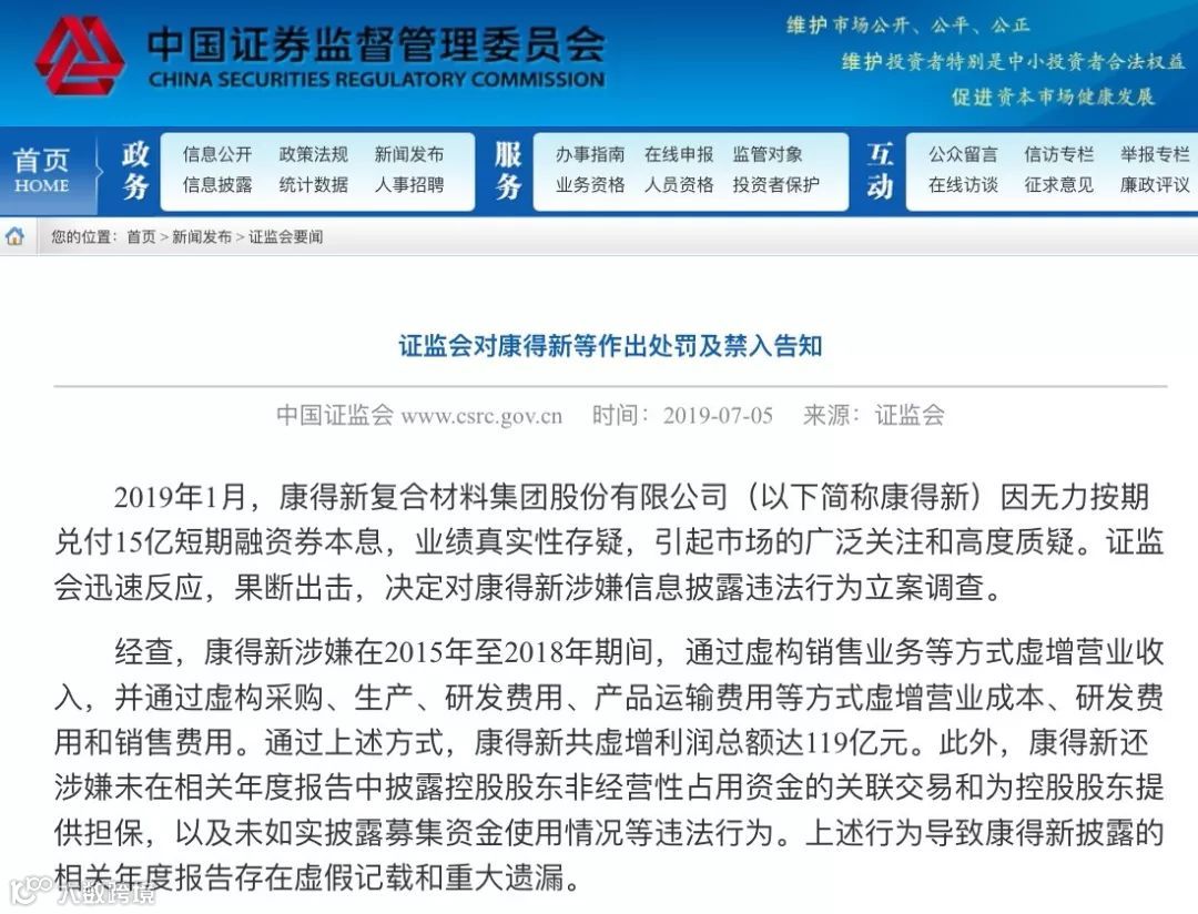 7月5日晚间,康得新收到中国证监会行政处罚事先告知书,因虚增利润119亿元,并存在涉嫌违规担保、未如实披露募资情况等违法行为,康得新被处以60万元罚款,实控人、时任董事长钟玉被处以90万元罚款并终身证券市场禁入,这均是当前《证券法》规定范围内的顶格处罚。
