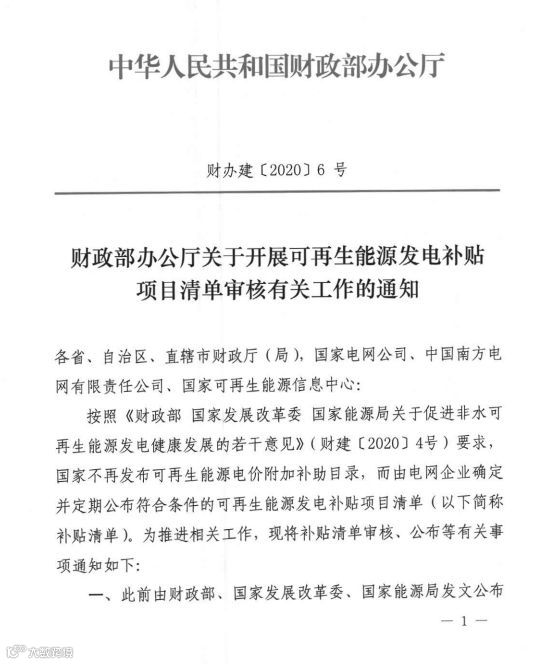 近日,财政部办公厅印发《关于开展可再生能源发电补贴项目清单有关工作的通知》(财办建〔2020〕6号),明确可再生能源项目进入首批财政补贴目录的条件。