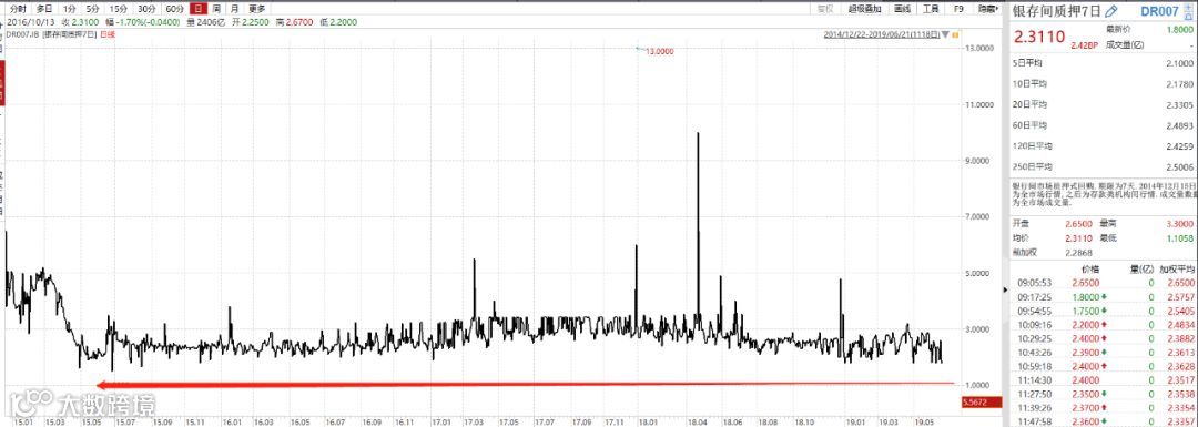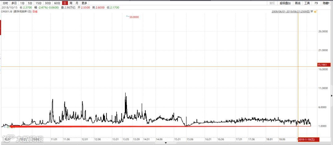 从历史情况来看,存款类机构隔夜回购利率(DR001),在2009年6月份前后,持续在1%以下运行。