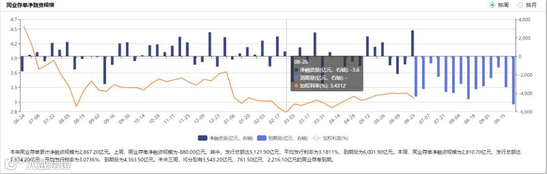 到了本周,同业存单净融资规模为2810.70亿元,发行总额达7174.20亿元,平均发行利率为3.0736%,到期量为4363.50亿元。