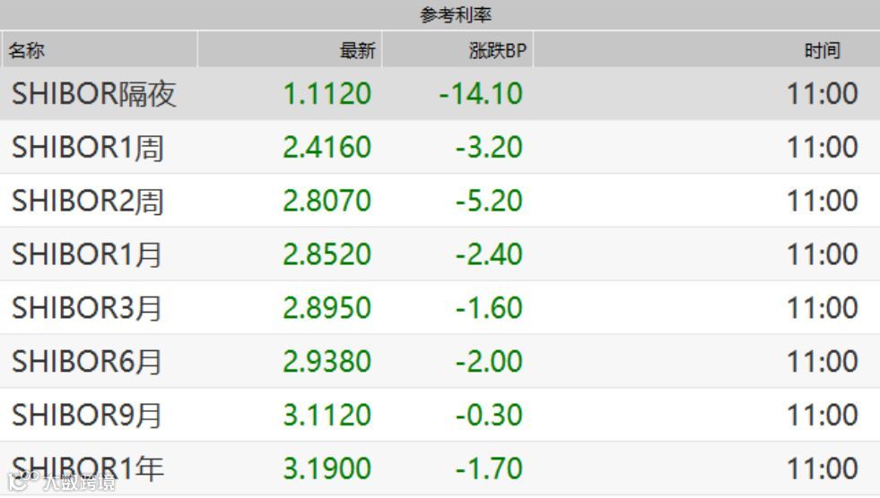 6月21日早间,上海银行间市场拆借利率(Shibor)全线下行,隔夜拆借利率报价1.112%,创下2015年6月份以来新低。