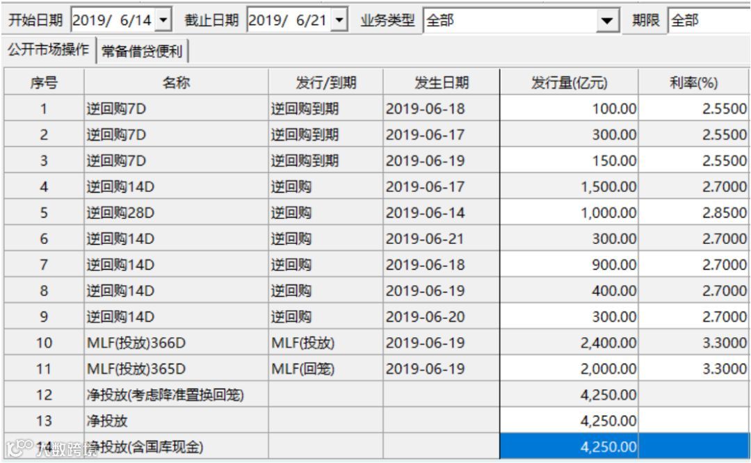根据WIND的统计显示,从6月14日到6月21日的一周来看,央行公开市场净投放规模达到了4250亿元,远远大于此前6月7日到6月14日一周净投放650亿元的规模,仅次于5月最后一周5100亿元。