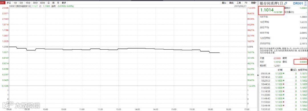 6月21日,从银行间市场质押式回购利率来看,存款类机构隔夜回购利率(DR001),下跌12.87bp,盘中最低跌到0.9000%,刷新了2009年9月份以来的最低点。但从收盘均价来看,报1.1007%,刷新2018年12月28日以来低点。