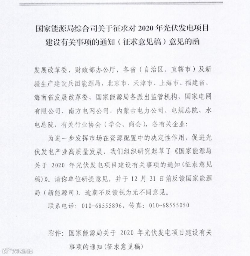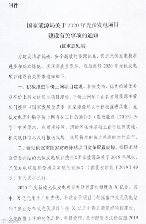近日,各省能源主管部门已经收到国家能源局下发的《关于征求对2020年光伏发电项目建设有关事项的通知(征求意见稿)意见的函》。