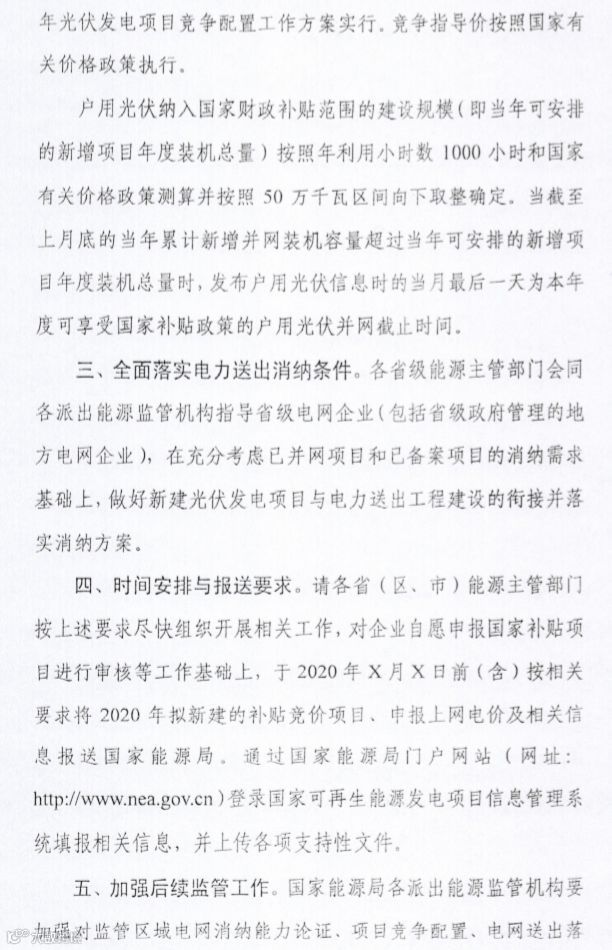 目前财政部、国家发改委价格司仍未明确2020年光伏补贴总额度以及指导电价,故征求意见稿中相关部门用X代替。