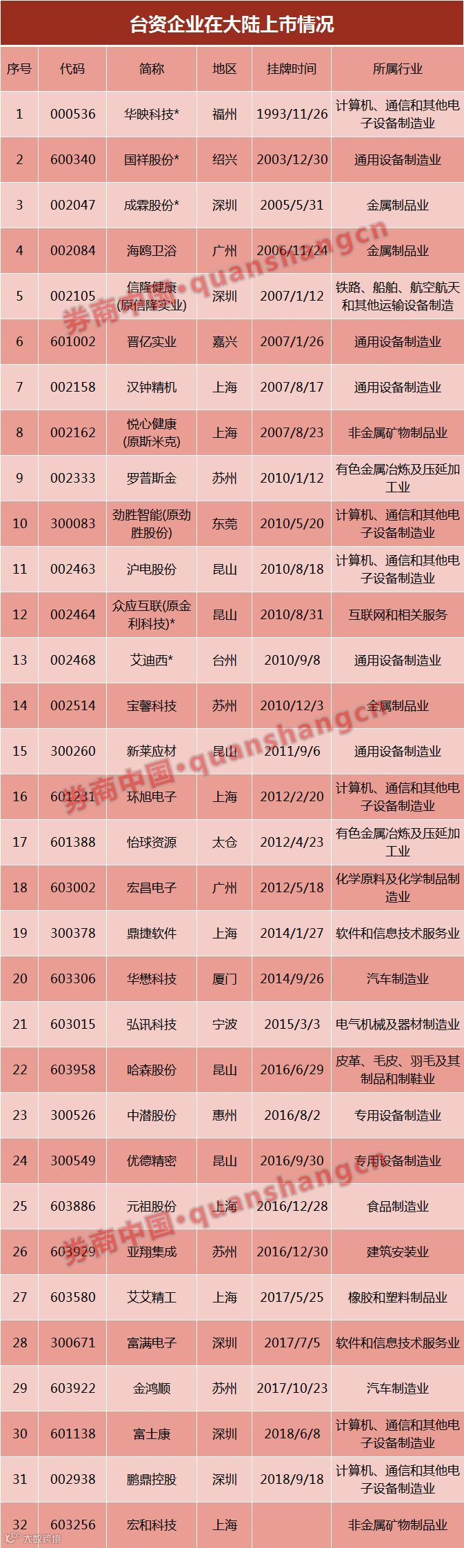 注2:2011年,原第一家台资A股上市公司浙江国祥制冷工业股份有限公司被华夏幸福借壳,注册地址变更为河北省,所属行业变更为房地产业。