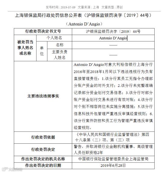 从上海银保监局7月9日发布的罚单信息公告中(作出的处罚日期是6月28日),可以看到,该行一位董事Antonio D’Angio被取消银行业金融机构董事、高级管理人员任职资格2年。案由是,对上述6项主要违法违规事实具有直接管理责任。