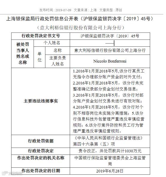 7月9日,上海银保监局发布的罚单信息显示,意大利裕信银行上海分行被罚1030万元,作出处罚日期为6月28日,并列明6项主要违法违规事实: