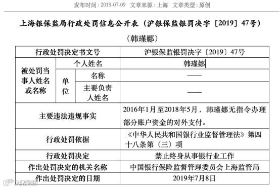 上海银保监局同日发布罚单里(作出的处罚日期是7月8日),一名叫韩瑾娜的个人作出禁止终身从事银行业工作的顶格处罚,主要违规事由为2016年1月至2018年5月无指令办理部分账户资金的对外支付。这与上述意大利裕信银行的罚单案由第一条“2016年1月至2018年5月,该分行某员工无指令办理部分账户资金的对外支付”相互重合。