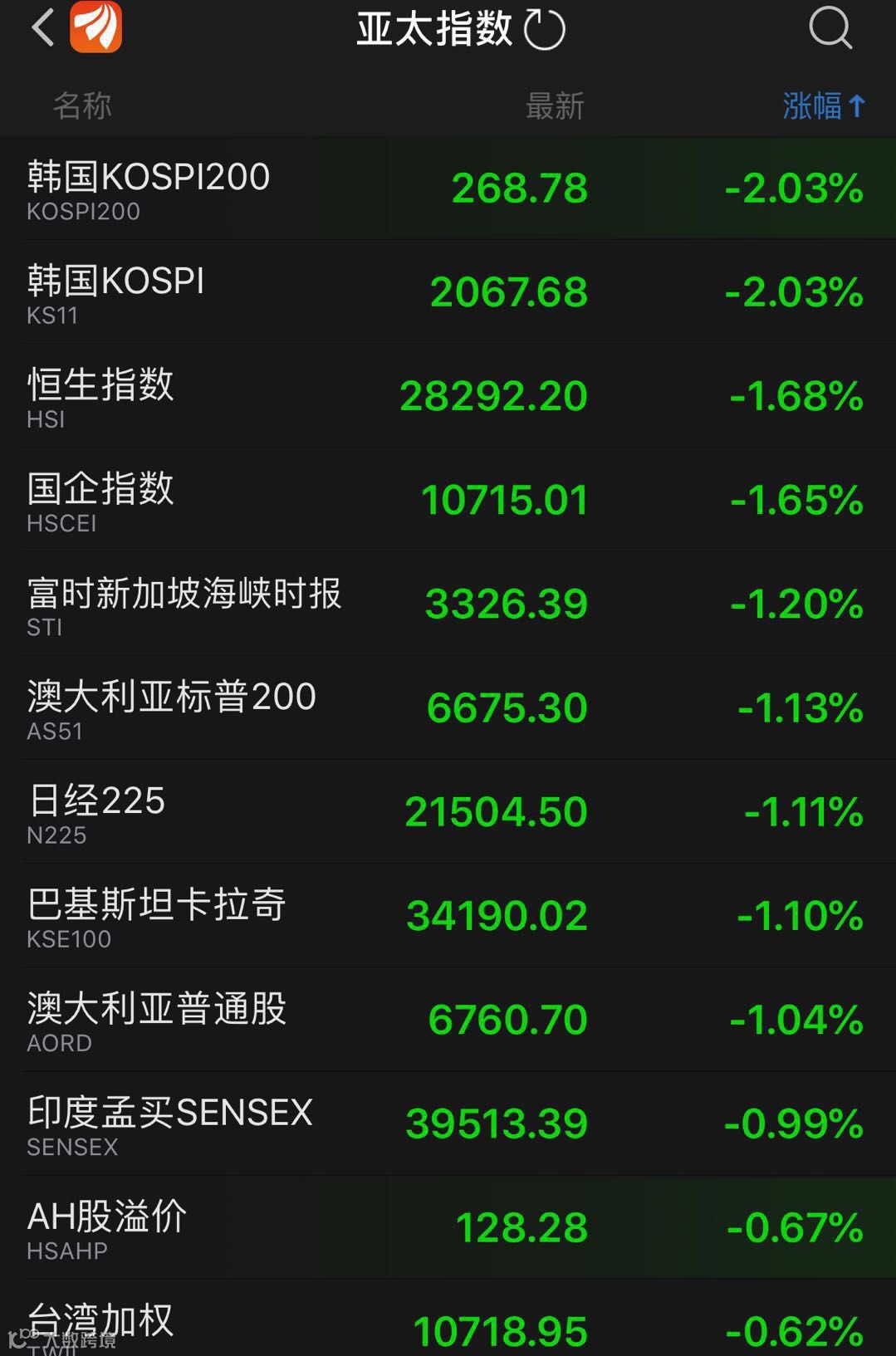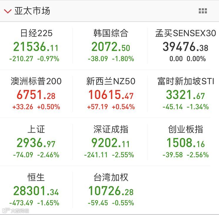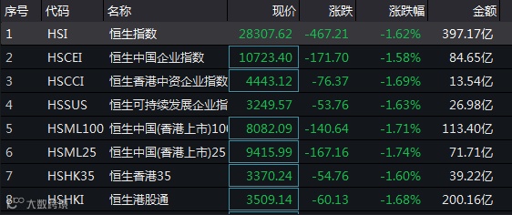 香港市场亦全线杀跌。多只细价股更是暴跌。北京体育文化(01803.HK)、承兴国际控股(02662.HK)跌超85%,中国水业集团(01129.HK)、瑞慈医疗(01526.HK)和亚洲电视控股(00707.HK)跌超40%。