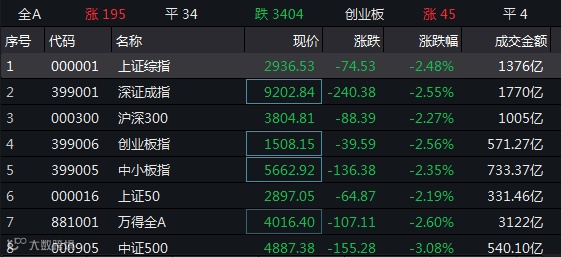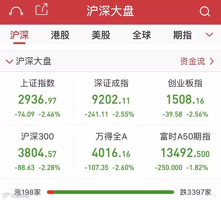 美国资本市场的表现引发了今早开盘的亚太股市的抛售潮,今天一早A股市场即出现了大幅跳水的情况。上证指数一度杀跌超过90点,跌幅亦超3%;核心资产上证50的最大跌幅亦超过2.8%;A股市值单日跌破1万亿元人民币。截至上午收盘,两市仅有203只股票上涨,3395只股票杀跌。所幸的是,跌停股票仅为6家,而涨停的有14家。