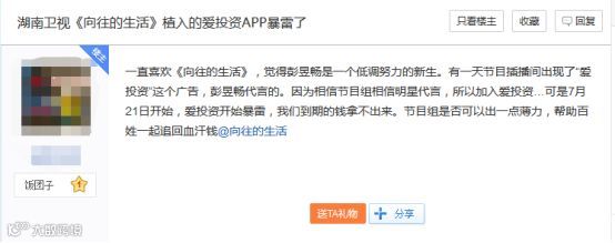 以此次被立案的爱投资为例,在项目逾期后,不少投资者表示,是通过观看《向往的生活》插播的爱投资广告才选择投资。“因为相信节目组相信明星代言,所以加入爱投资,节目组是否可以出一点力,帮助追讨血汗钱。”某投资者表示。