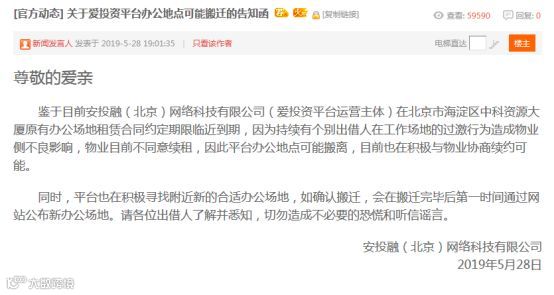 此外,今年5月28日,爱投资曾发布公告称,由于“持续有个别出借人在工作场地的过激行为”,平台办公地点可能撤离,目前在积极与物业协商。