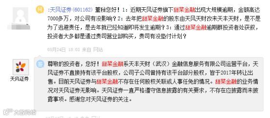 有投资者向天风证券董秘提问称,甜菜金融出现大规模逾期,金额高达7000多万,且投资者大多都是通过天风证券营业部购买,是否有垫付计划。对此,天风证券表示,甜菜金融系天丰天财(武汉)金融信息服务有限公司运营平台,公司子公司曾持有该平台部分股权,皆于2017年转让出售。目前天风证券与甜菜金融不存在任何股权关联或人事任免的情况,甜菜金融的业务情况对天风证券无影响。