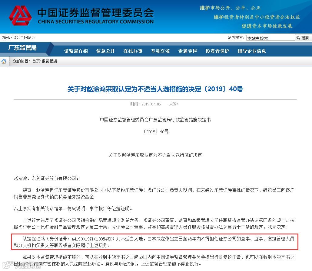 上述行为违反了《证券公司代销金融产品管理规定》第六条、《证券公司董事、监事和高级管理人员任职资格监管办法》第四条的规定。广东证监局指出,“按照相关法律法规规定,我局决定认定赵淦鸿(身份证号:44190019710109547X)为不适当人选,自本决定作出之日起两年内不得担任证券公司的董事、监事、高级管理人员和分支机构负责人等职务或者实际履行上述职务”。