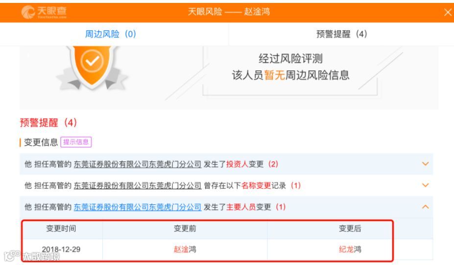 今年4月19日,东莞证券虎门分公司就曾因此事,被广东证监局采取出具警示函措施的决定。天眼查显示,在2018年12月29日,该分公司法人已由“赵淦鸿”变更为“纪龙鸿”。