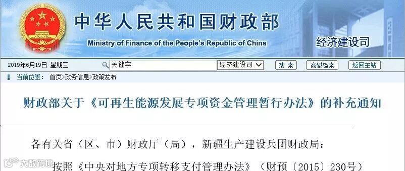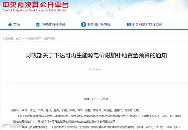 昨天,财政部发布的财建〔2019〕275号《财政部关于下达可再生能源电价附加补助资金预算的通知》通知,刷爆了光伏人士的朋友圈。