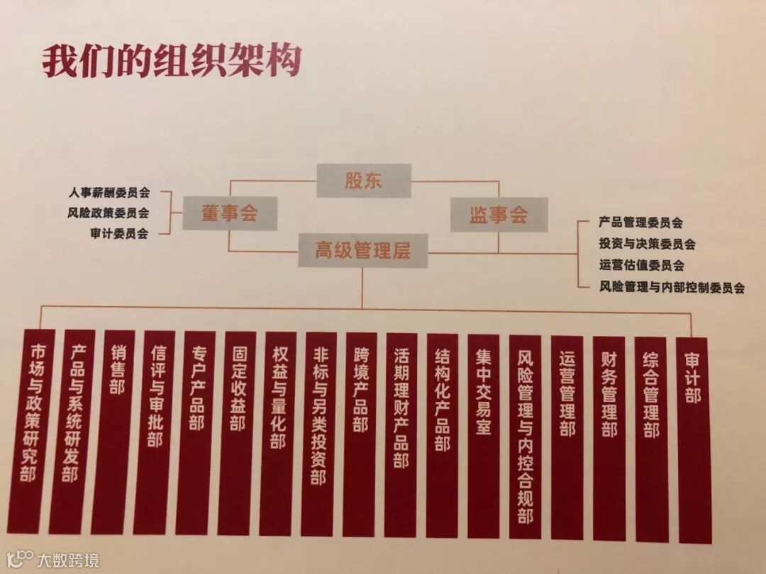 从组织架构看,中银理财董事会下设人事薪酬委员会、风险政策委员会和审计委员会,高级管理层下设产品管理委员会、投资与决策委员会、运营估值委员会、风险管理与内部控制委员会等4个委员会以及17个业务部门。