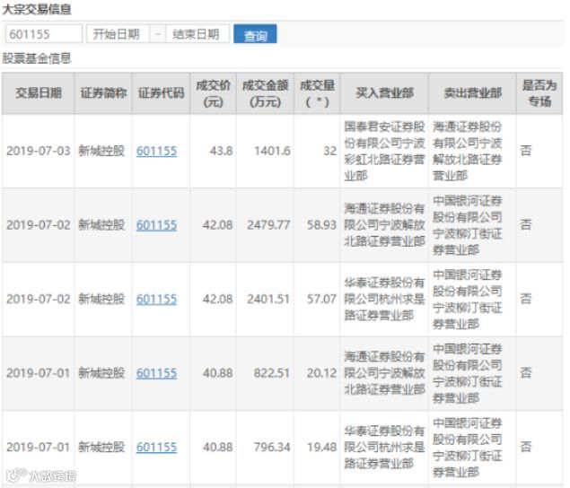 7月3日,新城控股发生1笔大宗交易,总成交数量为32万股,总成交金额为1401.6万元,成交价格为43.8元/股,较当日收盘价溢价2.6%。买入方为国泰君安证券宁波彩虹北路证券营业部,卖出方为海通证券宁波解放北路证券营业部。