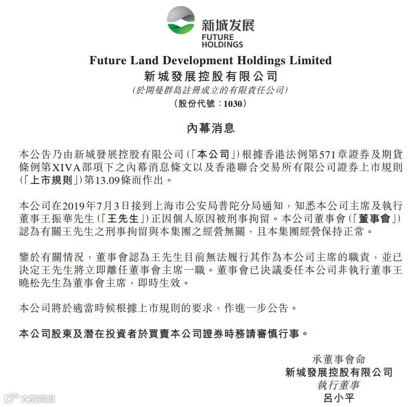 随即,新城股份也发布了《关于公司董事长变更的公告》,公告显示,公司实际控制人、董事长王振华先生因个人原因被刑事拘留,公司选举董事兼总裁王晓松先生任公司第二届董事会董事长。