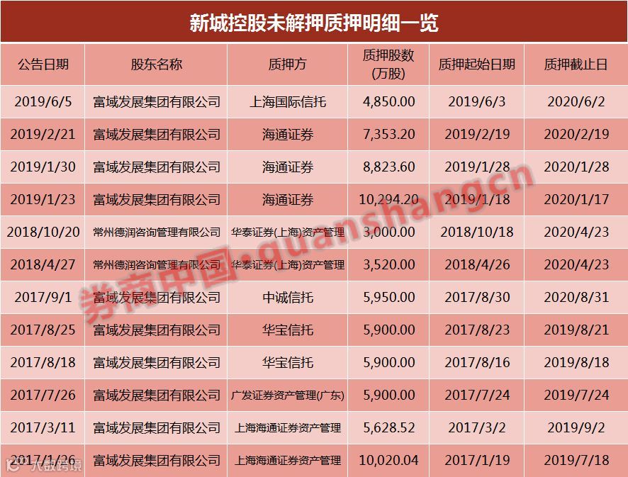 据WIND数据显示,新城控股处于质押中的股票约7.7亿股,占总股本的34%,其中,富域发展集团有限公司累计质押7.06亿股,其持股13.78亿股,质押占比51.25%;常州德润咨询管理有限公司累计质押6520万股,其持股1.38亿股,质押占比47.31%。此外,质押方涉及中诚信托、上海海通证券资产管理、上海国际信托、华泰证券(上海)资产管理、华宝信托、海通证券、广发证券资产管理(广东)等。