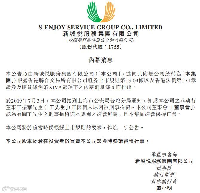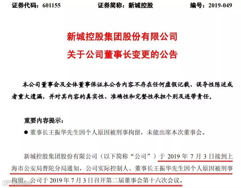 新城控股发布更换董事长的公告,公告中提到新城控股于 2019 年7月3日接到上海市公安局普陀分局通知,公司实际控制人、董事长王振华先生因个人原因被刑事拘留,公司于2019 年7月3日召开第二届董事会第十六次会议。董事会全票选举了公司董事兼总裁王晓松先生任公司第二届董事会董事长,王振华先生将继续担任公司第二届董事会董事职务。