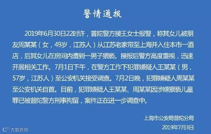 随后,上海普陀警方发表警情通报,2019年6月30日22时许,上海普陀警方接王女士报警,称其女儿被朋友周某某(女,49岁,江苏人)从江苏老家带至上海并入住本市一酒店,后其女儿在房间内遭到一男子猥亵。接报后警方高度重视,迅速开展相关工作。7月1日下午,在警方工作下犯罪嫌疑人王某某(男,57岁,江苏人)至公安机关接受调查。7月2日晚,犯罪嫌疑人周某某至公安机关自首。目前,犯罪嫌疑人王某某、周某某因涉嫌猥亵儿童罪已被普陀警方刑事拘留,案件正在进一步调查中。