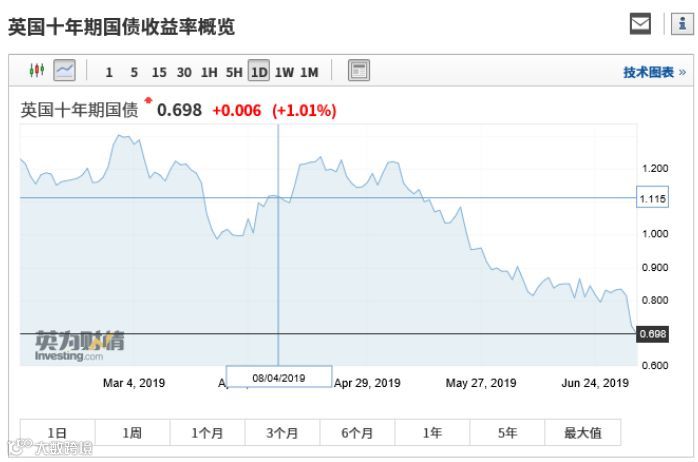 英国10年期国债收益率跌至0.698%,创下2016年8月来的最低水平;