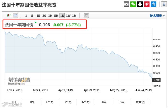法国十年期国债收益率跌至-0.106%,为有史以来首次。