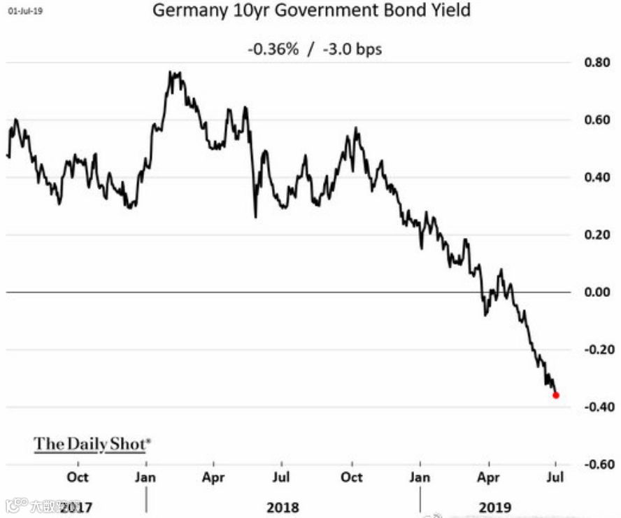 德国10年期国债收益率跌至-0.394%,创下纪录新低。