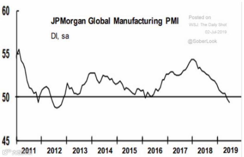 近日,摩根大通全球制造业PMI指数正式公布,6月录得49.4,跌至6年半最低水平,弱于5月前值49.8,也是2012年下半年以来首次连续两个月不足50荣枯线。