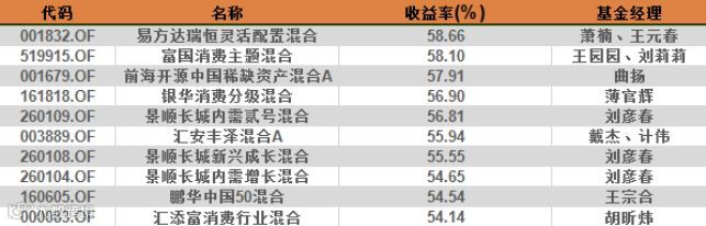 混合型基金中,由萧楠、王元春管理的易方达瑞恒灵活配置混合以58.66%的收益率获得半年度冠军;由王园园、刘莉莉管理的富国消费主题混合以58.10%的收益率获得半年度亚军;由曲扬管理的前海开源中国稀缺资产混合A以57.91%的收益率获得半年度季军。