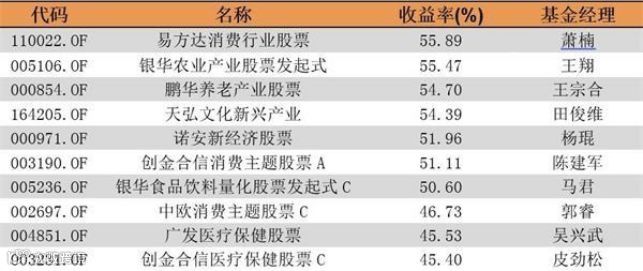 普通股票型基金中,由萧楠管理的易方达消费行业股票以55.89%的收益率获得半年度冠军;由王翔管理的银华农业产业股票发起式以55.47%的收益率位列第二;由王宗合管理的鹏华养老产业股票以54.70%的收益率获得半年度季军。
