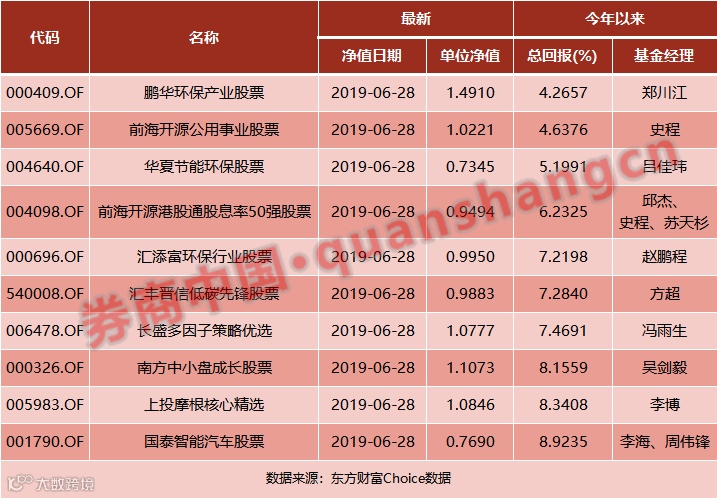 若只看上半年的业绩表现,股票型中鲜有亏损的产品。Choice数据显示,若剔除规模小于5000万的基金,股票型基金涨幅位列全行业后十位的涨幅也在4.27%-8.92%区间,这些产品中不少是环保主题概念,其中包括鹏华环保产业股票基金、汇添富环保行业股票、汇丰晋信低碳先锋股票等。