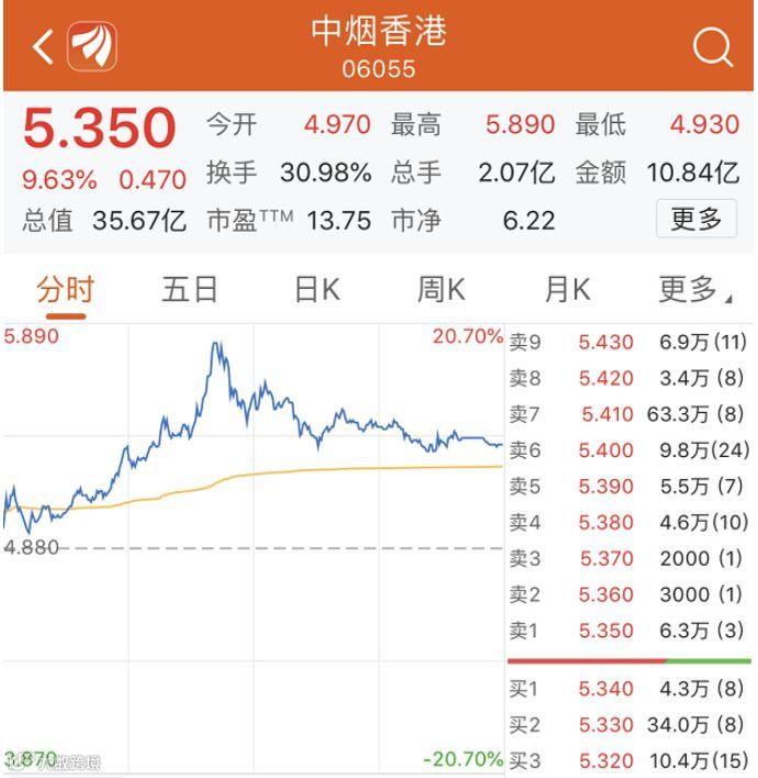 中烟香港首日表现较好,二级市场股价全天在高位震荡,挂牌高开1.84%,报4.94港元。随后,股价一路震荡上行,一度涨逾20%,收盘时涨幅定格在9.63%,报5.35港元。