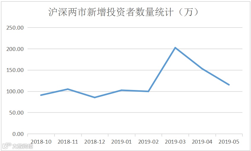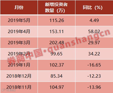 在此背景下,今天下午,中国结算披露了5月沪深两市的新增投资者数量——115.26万,同比增加4.49%,环比减少24.72%,增速已大幅收敛,基本回复至3月之前在100万左右的正常水平。