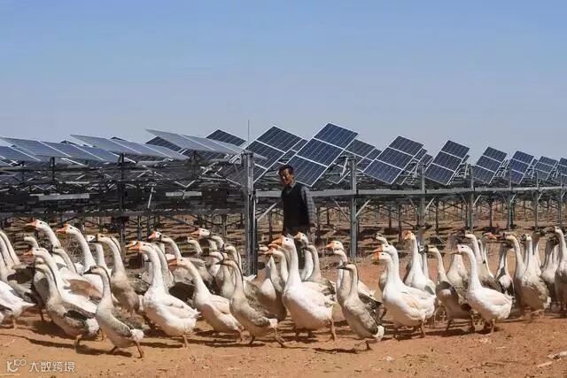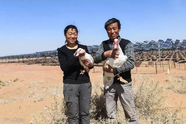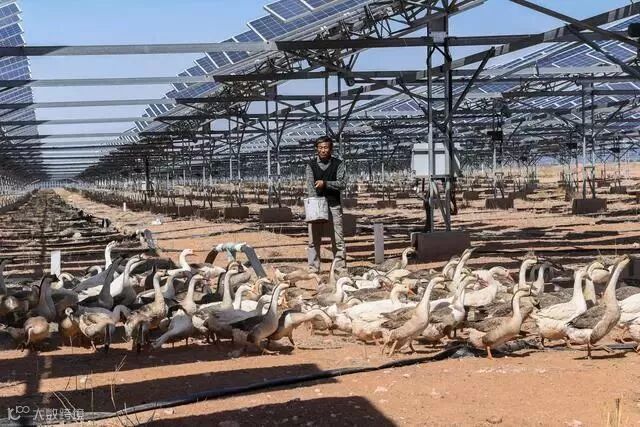 2018年4月,内蒙古自治区杭锦旗独贵塔拉镇杭锦淖尔村的杨凤祥和妻子杨绿女结束多年的外出务工生活,在当地政府和企业的扶贫政策帮助下,来到位于独贵塔拉镇的亿利治沙光伏电站,开始在光伏板下养鹅。一年来,夫妻俩的纯收入达到4万多元。