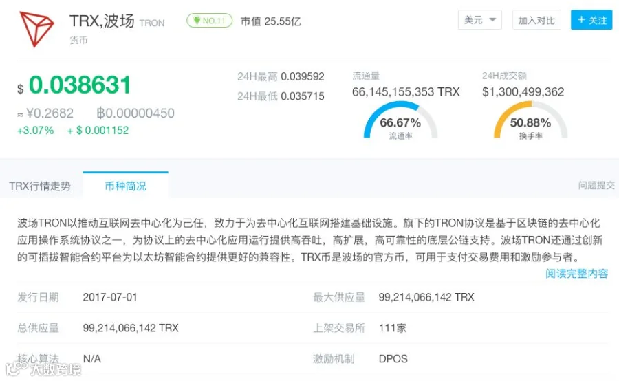 “波场TRON”是孙宇晨于2017年创立的区块链项目。根据宣传资料,波场TRON是基于区块链的去中心化内容协议,其目标在于通过区块链与分布式存储技术,构建一个全球范围内的自由内容娱乐体系,这个协议可以让每个用户自由发布,存储,拥有数据,并通过去中心化的自治形式,以数字资产发行,流通,交易方式决定内容的分发、订阅、推送,赋能内容创造者,形成去中心化的内容娱乐生态。