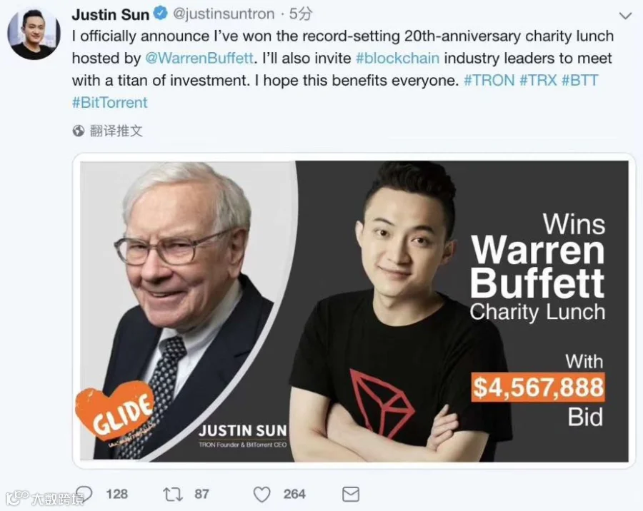 2019年巴菲特慈善午餐拍卖赢家身份揭晓!中国人、来自“币圈”、90后——波场TRON创始人孙宇晨。