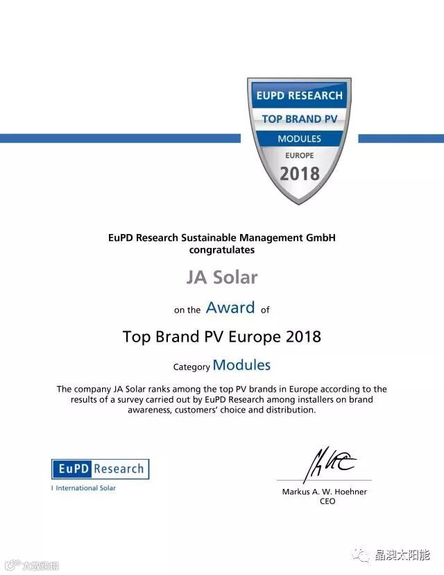 全球最大的高性能太阳能产品制造商之一晶澳太阳能 (JASO) 今天宣布获得全球权威研究机构EuPD Research授予的“2018年欧洲顶级光伏品牌”。这是晶澳自2016年以来连续三次获此荣誉。