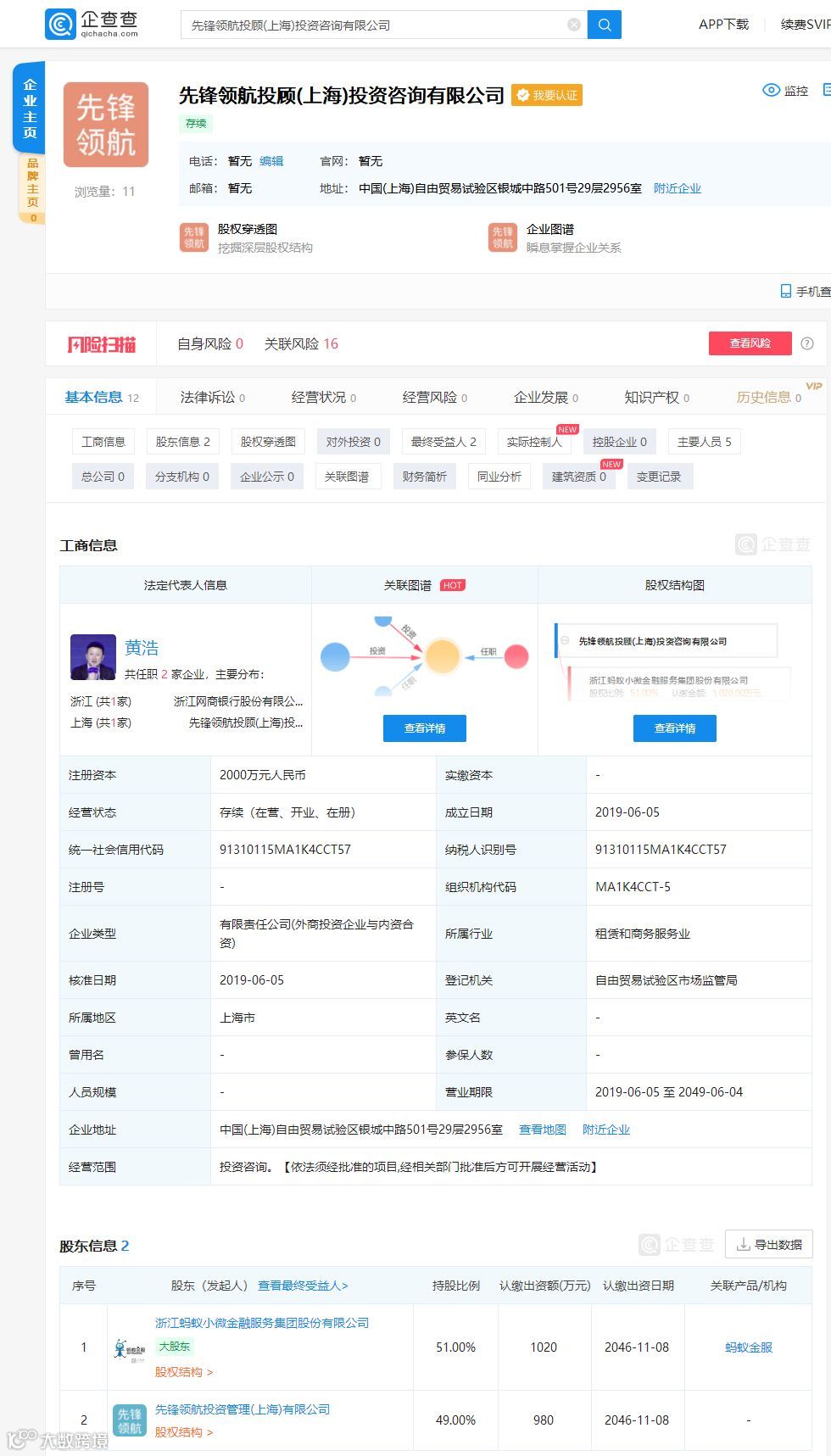工商信息显示,先锋领航投顾经营范围为投资咨询,法定代表人为浙江网商银行股份有限公司行长、执行董事黄浩。股权结构为:大股东浙江蚂蚁小微金融服务集团股份有限公司持股51%,另一位股东先锋领航投资管理(上海)有限公司持股49%。