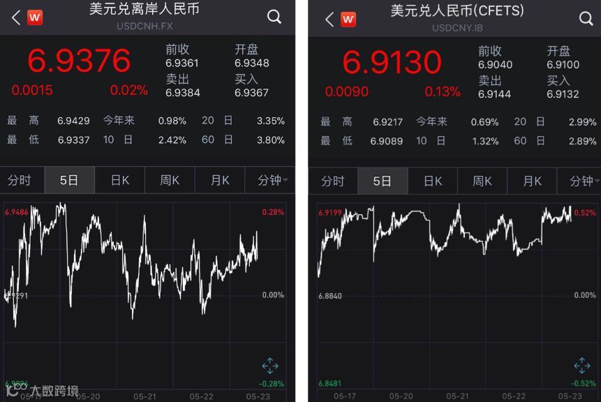 5月23日,在岸和离岸人民币兑美元汇率小幅走贬,截至记者发稿前(16:50),在岸和离岸跌幅不足百点,在岸在6.91附近震荡,离岸则连续多日在6.93附近波动。不少分析人士指出,从近期央行频频出手稳汇率的诸多动作看,人民币汇率短期内破7不太可能。