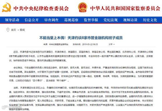 5月22日,中央纪委国家监委网站上刊登,“不能当堂上木偶!天津约谈8家市管金融机构班子成员”,引人外界高度关注。